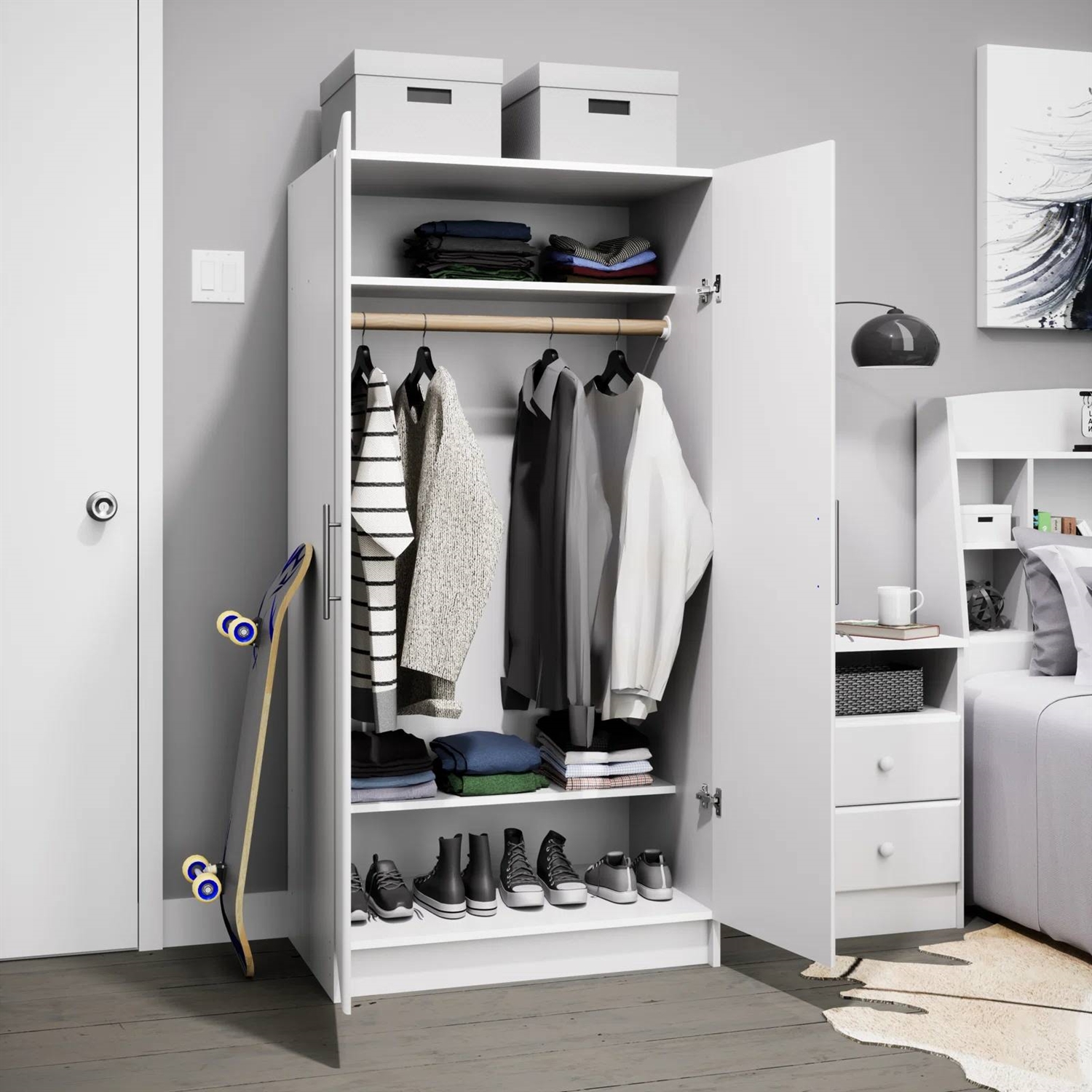 • Easy Assembly: Description The armoire wardrobe closet is designed for convenience, arriving flat-packed with an instructional booklet for easy assembly lessening the weight of home organization. This storage cabinet with doors and shelves makes setting up your portable closet effortless.